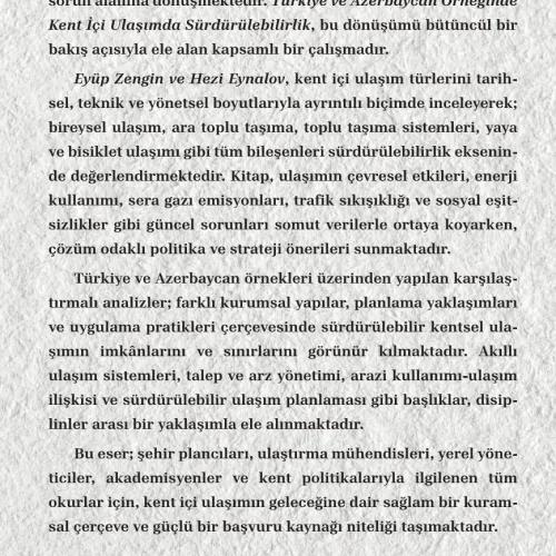 Türkiye ve Azerbaycan örnekleri üzerinden yapılan karşılaştırmalı analizler; farklı kurumsal yapılar, planlama yaklaşımları ve uygulama pratikleri çerçevesinde sürdürülebilir kentsel ulaşımın imkânlarını ve sınırlarını görünür kılmaktadır. Akıllı ulaşım sistemleri, talep ve arz yönetimi, arazi kullanımı-ulaşım ilişkisi ve sürdürülebilir ulaşım planlaması gibi başlıklar, disiplinler arası bir yaklaşımla ele alınmaktadır.